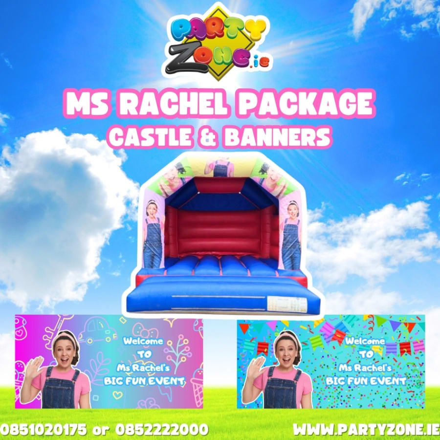 With this package you get a 12ft x 12ft Ms Rachel castle! Also customisable banners for every occasion. Birthdays... Events... Christenings... You name it!