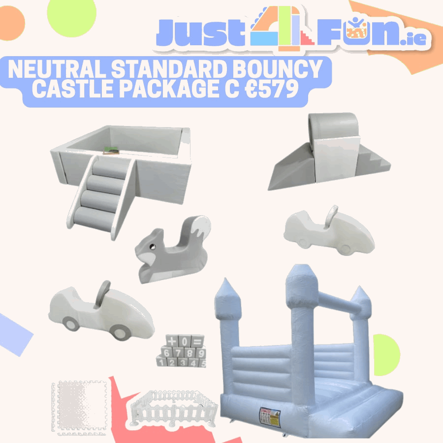 The Neutral Standard Bouncy Castle Package C is a modern soft play and inflatable combo in elegant white and grey tones — perfect for Dublin birthdays, baby showers, and family celebrations. With its stylish all-white castle and matching soft play pieces, this setup offers a clean, contemporary look that blends perfectly into any event décor.