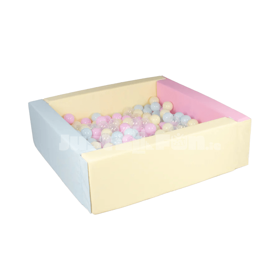 Colours: Pastel Mix Sizes: Inlet dimension 80x80cm, Total assembled dimension 100x100cm, Separate Pieces 90x30x10cm, Height approx. 30cm Material: Filled with T-21 upholstery foam with hygiene certificate. The foam, with increased density, has a high elasticity and resistance to indentation. Please note: Children to be supervised by an adult at all times. We recommend that you encourage your child to step into the ball pit to prevent damage to the sides. Regular and excessive pressure on the sides may result in misshapen foam which is not covered by the manufacturer.