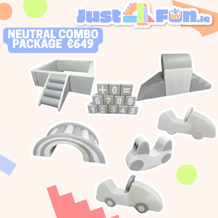 The Neutral Combo Package is a stylish, modern soft play setup in elegant white and grey tones — perfect for Dublin birthdays, christenings, and baby showers. This beautifully balanced package includes all the popular neutral play pieces, offering a clean, minimalist look that blends effortlessly into any event theme or décor.