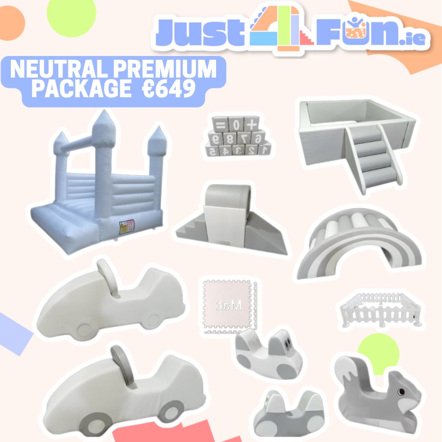 The Neutral Combo Package is a stylish, modern soft play setup in elegant white and grey tones — perfect for Dublin birthdays, christenings, and baby showers. This beautifully balanced package includes all the popular neutral play pieces, offering a clean, minimalist look that blends effortlessly into any event theme or décor.